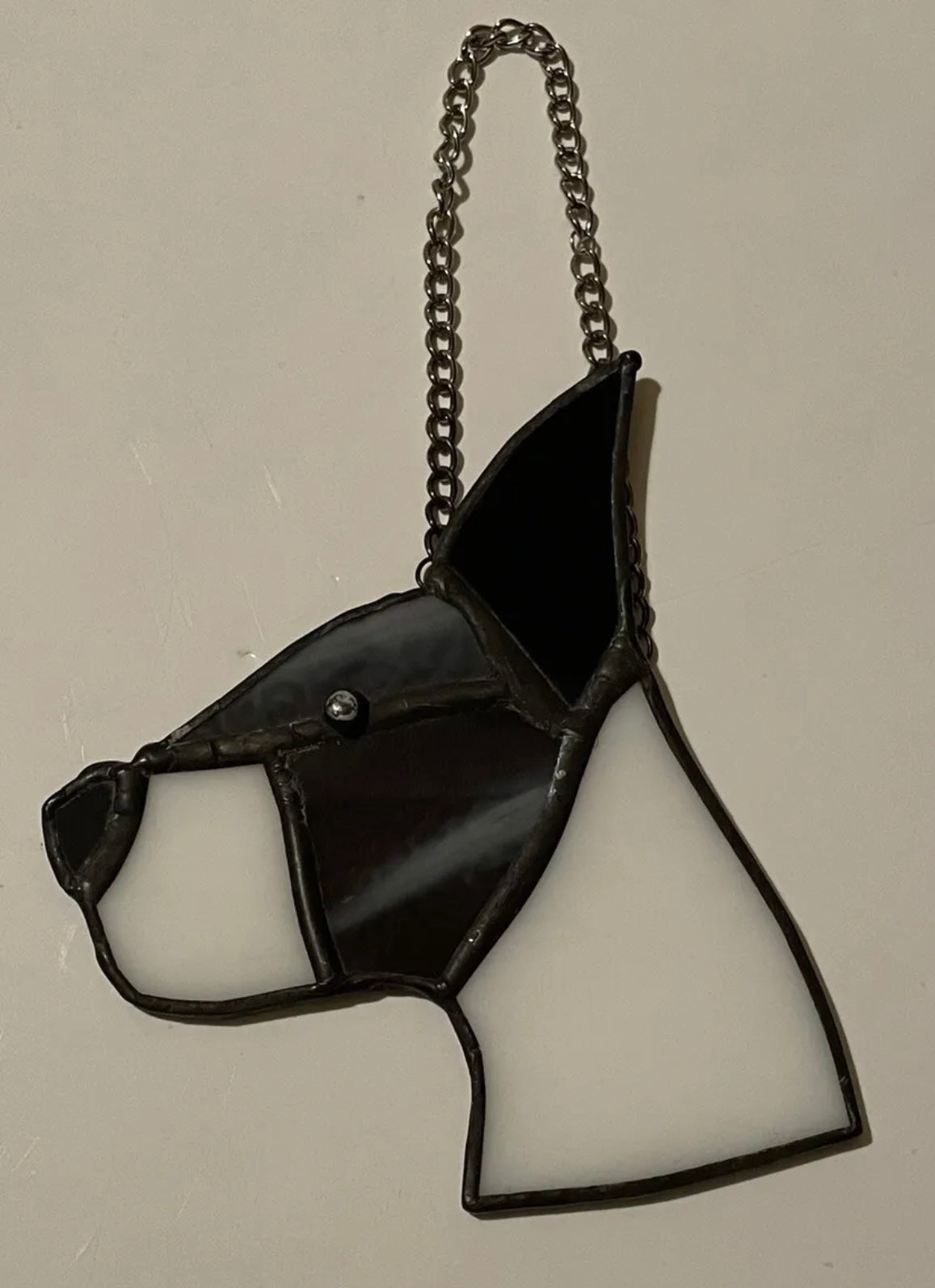 Measures 7 1/2" H x 4" L, including chain.