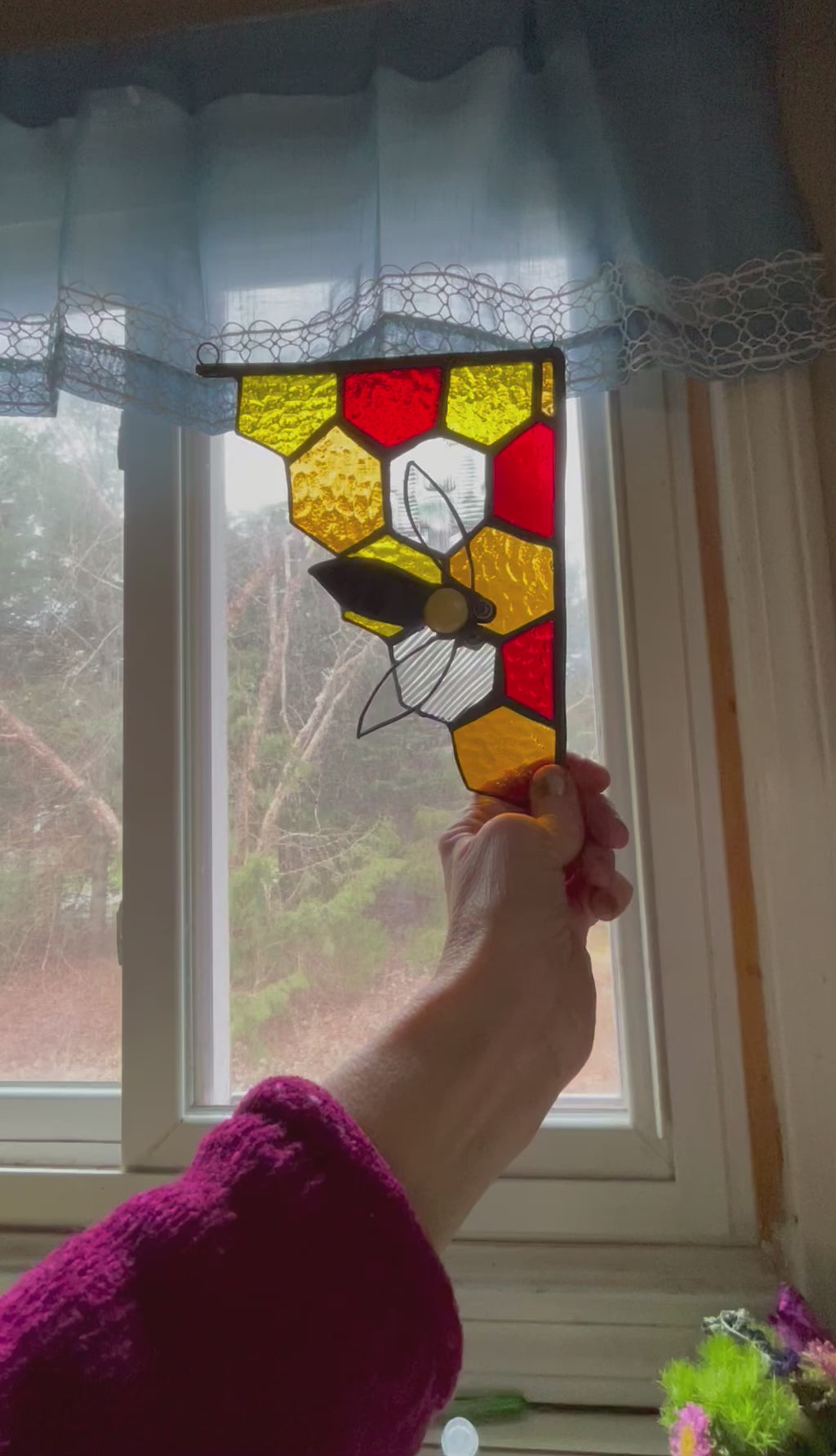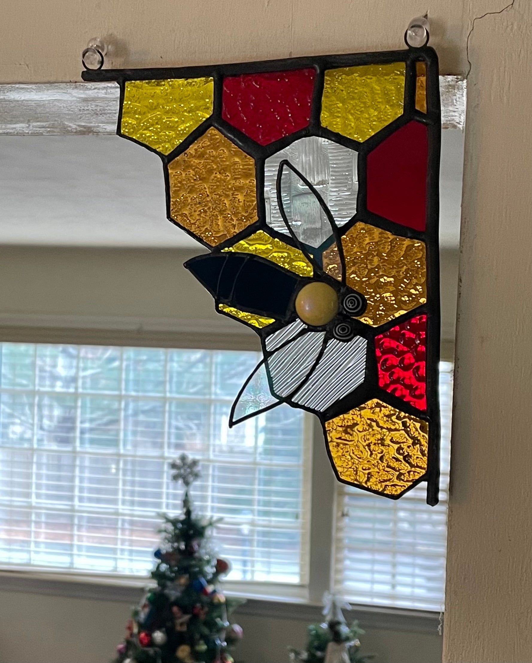 Created in genuine stained glass using the copper foil method. Corners of piece are framed with metal came and finished in a black patina for a quality piece of glass art to last throughout the years!