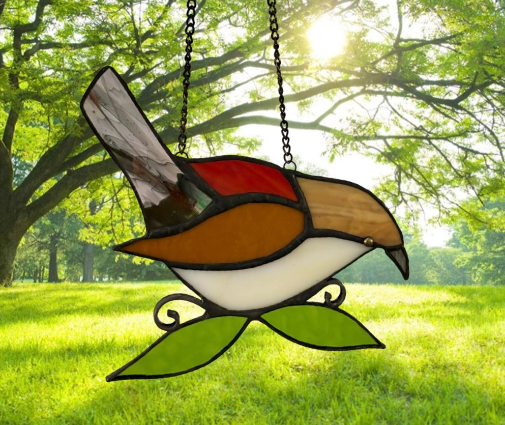 Created in genuine stained glass using the copper foil method & finished in a black patina for a quality piece of glass art to last throughout the years!