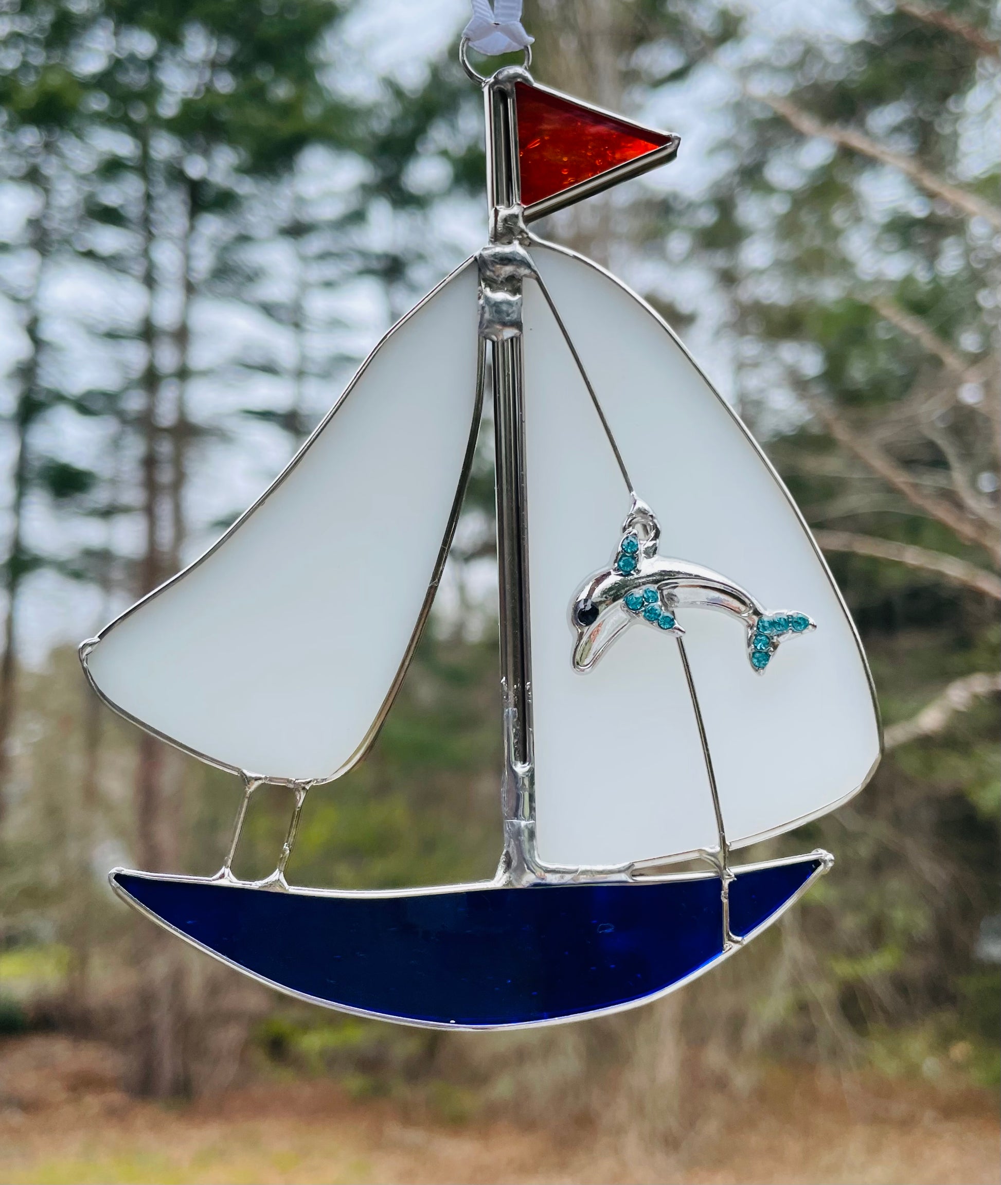 A sweet nautical piece, this sailboat arrives with a dolphin charm!