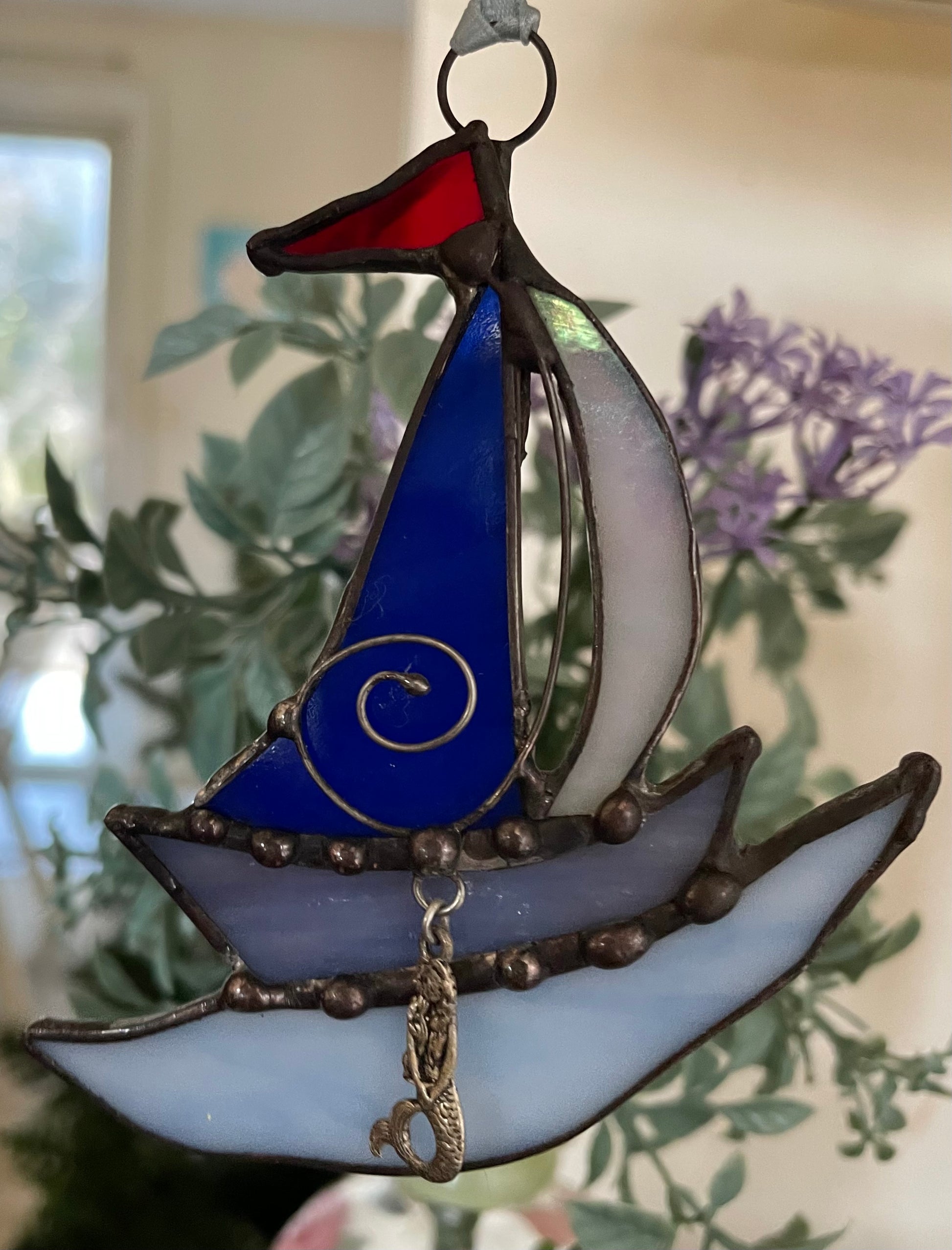 This miniature suncatcher has a mermaid hitching a ride! This sailboat arrives with a mermaid charm and will make a lovely addition to your beach decor!