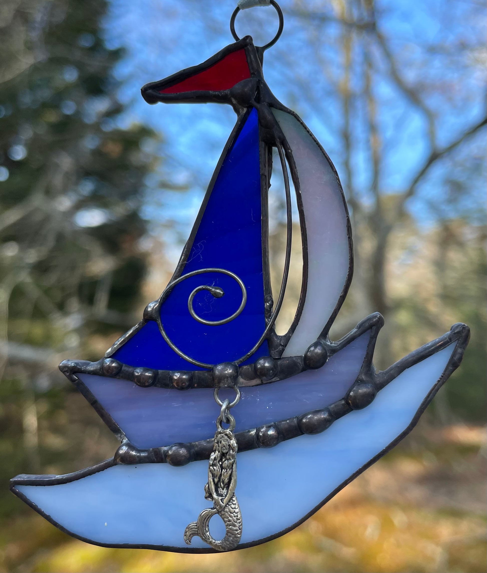 Created in genuine stained glass using the copper foil method & finished in a black patina with a mermaid charm attached for a quality piece of glass art to last throughout the years!