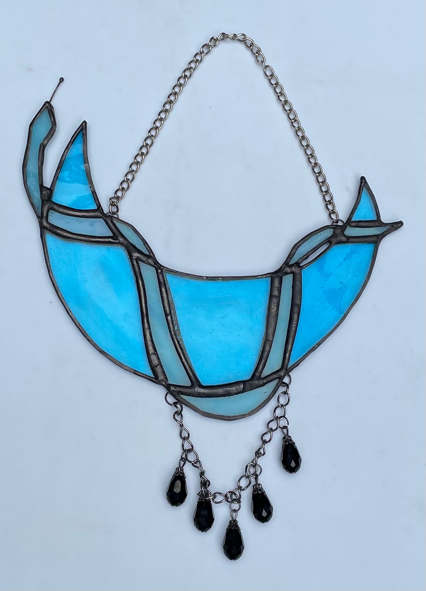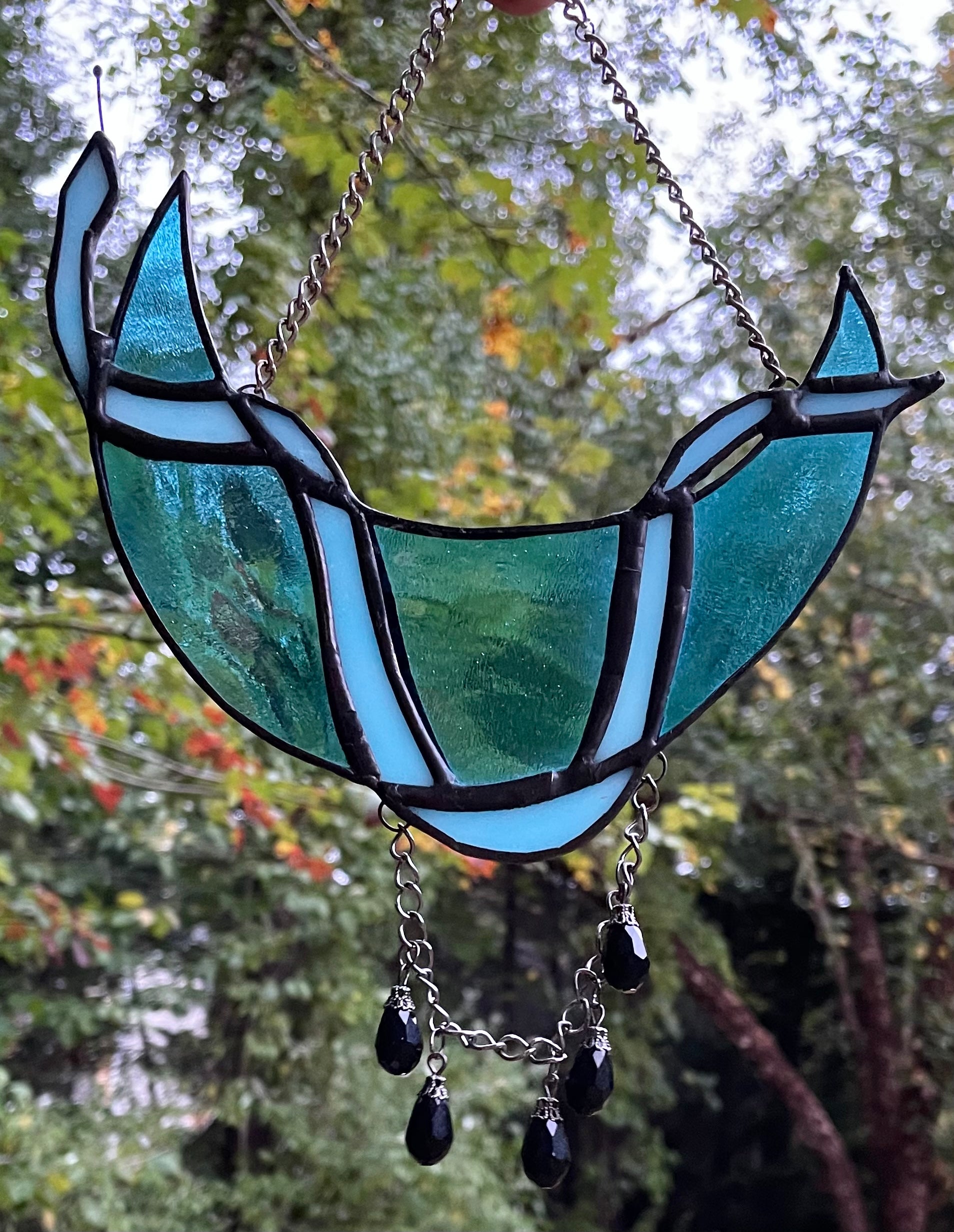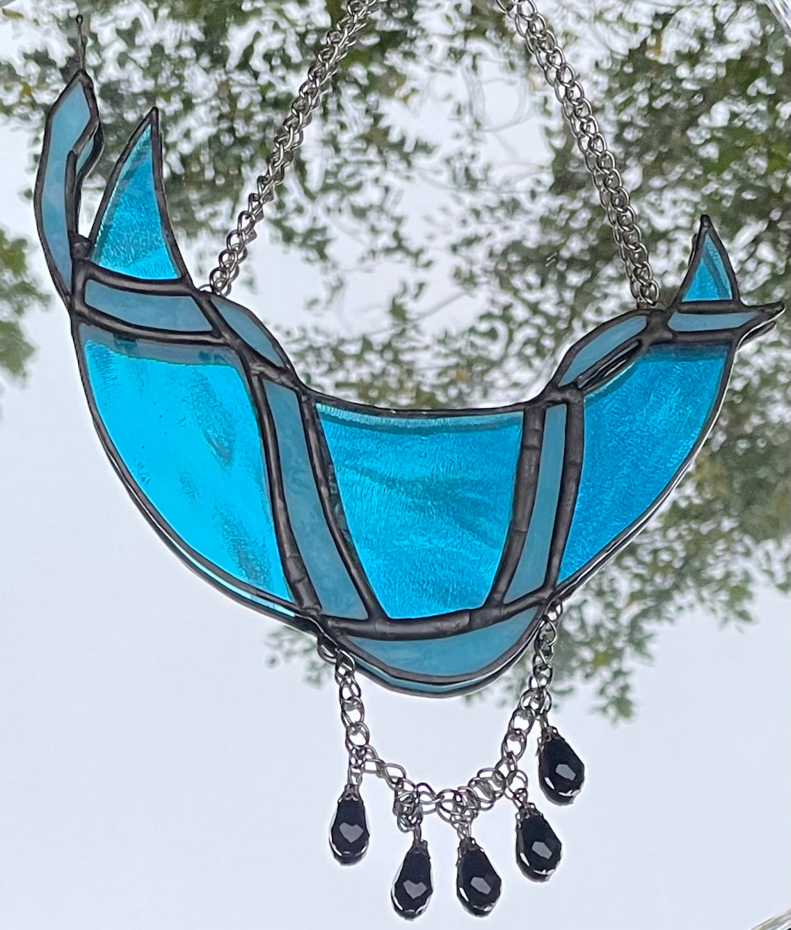 Created in genuine stained glass using the copper foil method & finished in a black patina & added beads for a quality piece of glass art to last throughout the years!