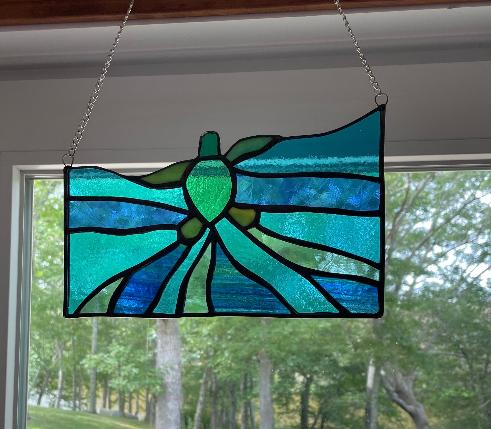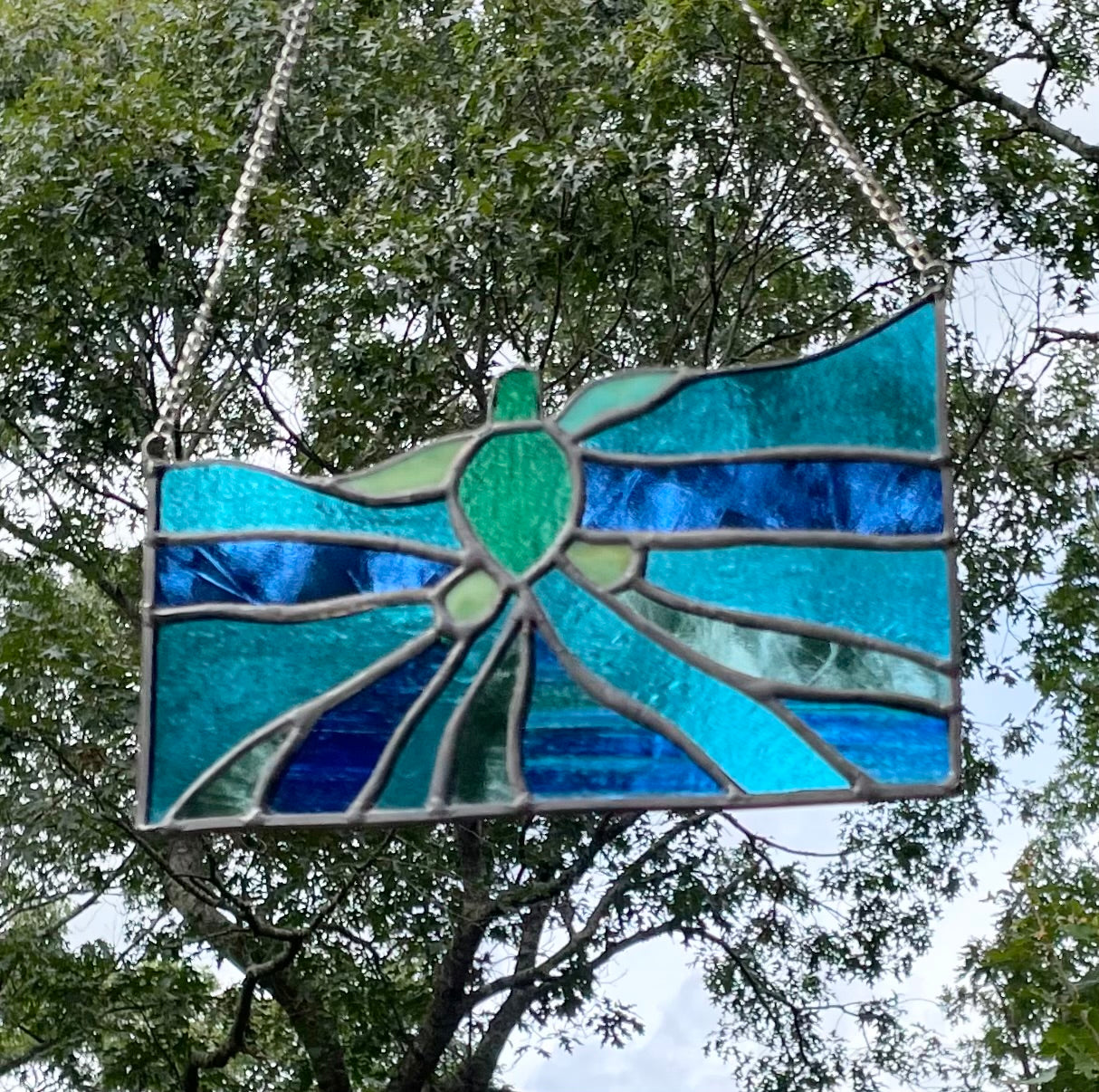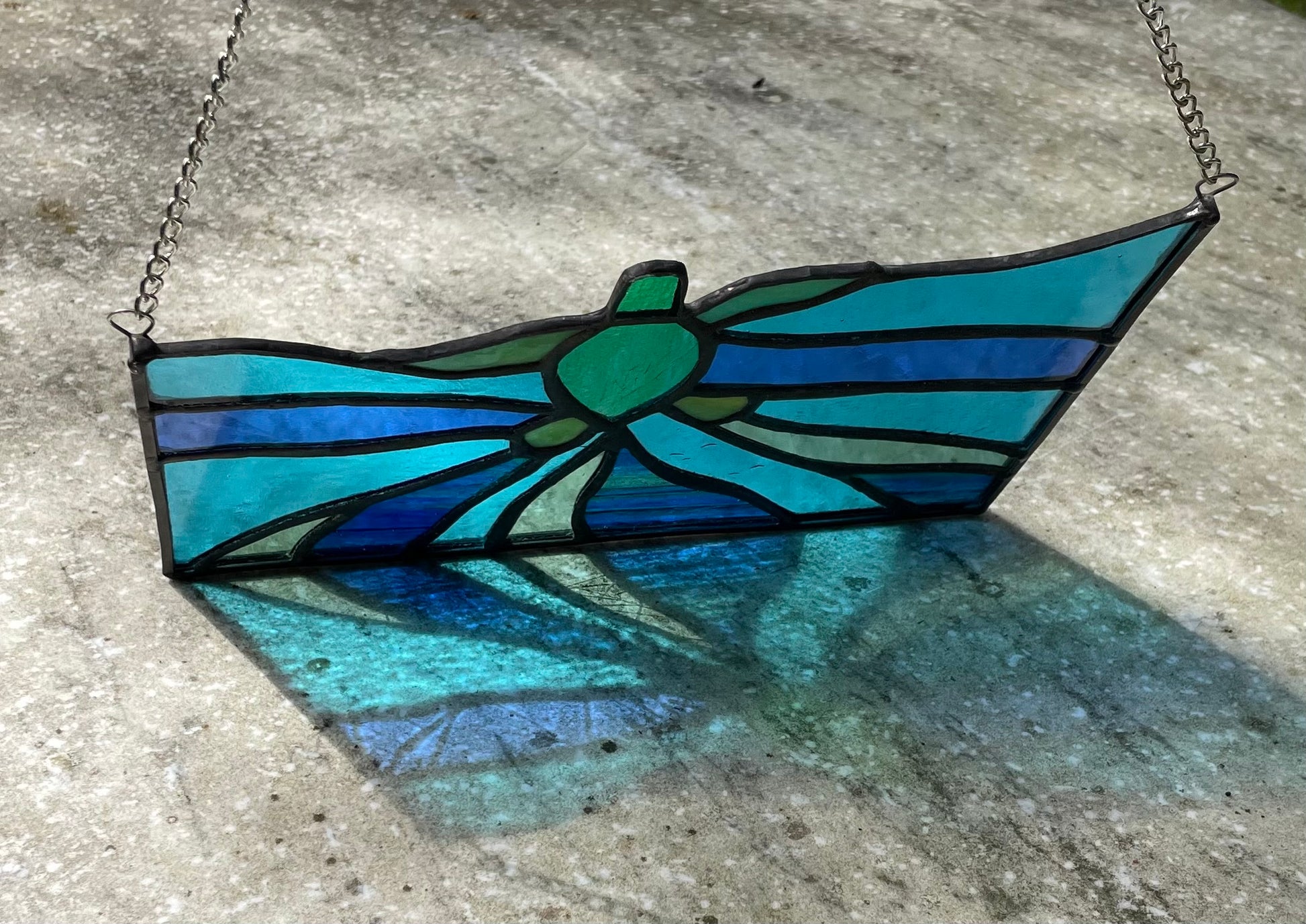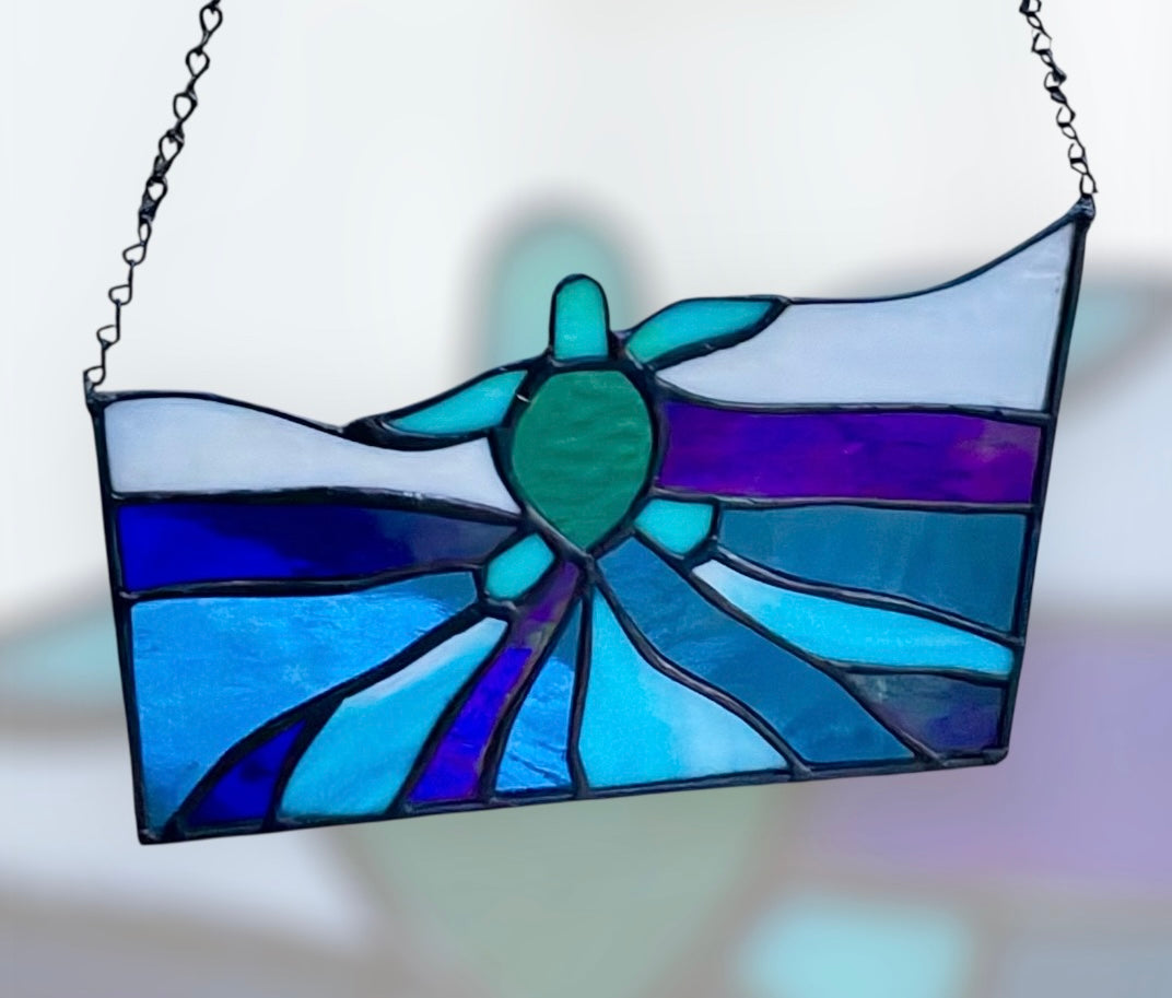 Created in genuine stained glass using the cooper foil method. It is them framed in metal and finished in a black patina for a quality piece of glass art to last throughout the years!