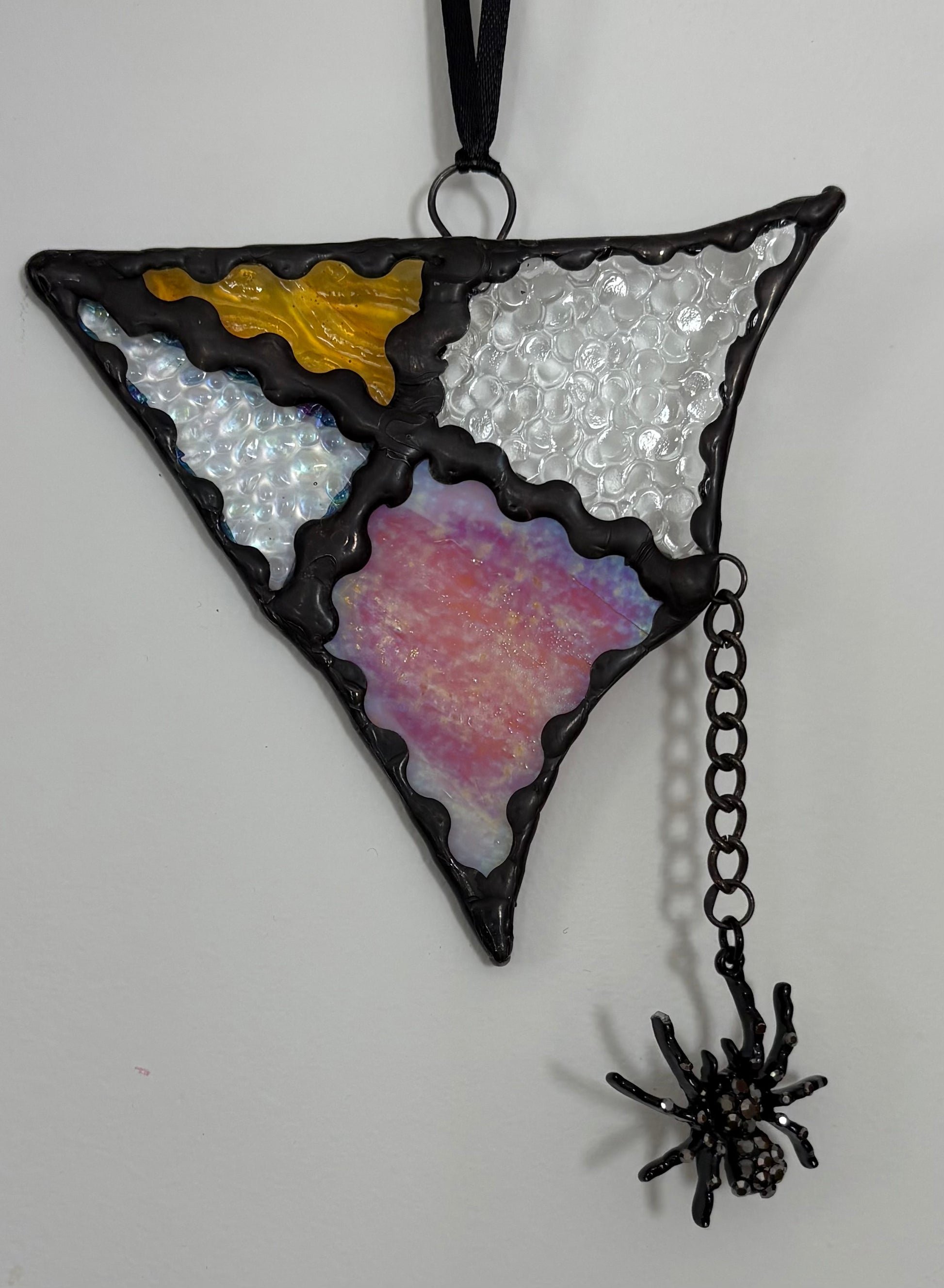 Created in genuine stained glass using the copper foil method and finished with a black patina + a little spider charm for a quality piece of glass art to last throughout the years!