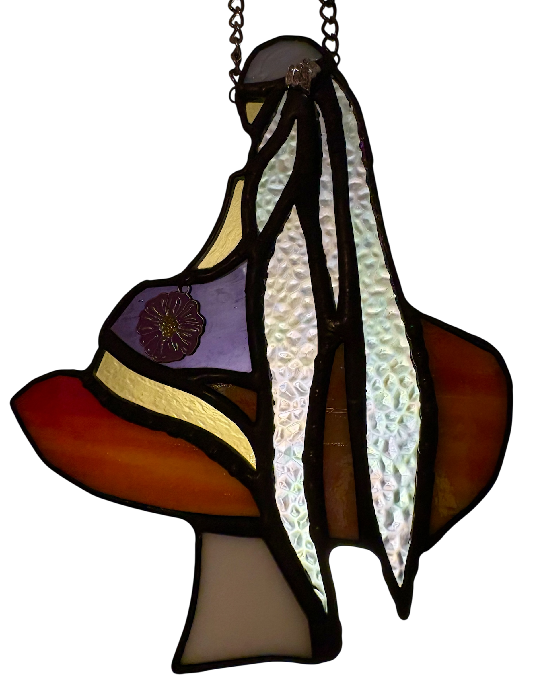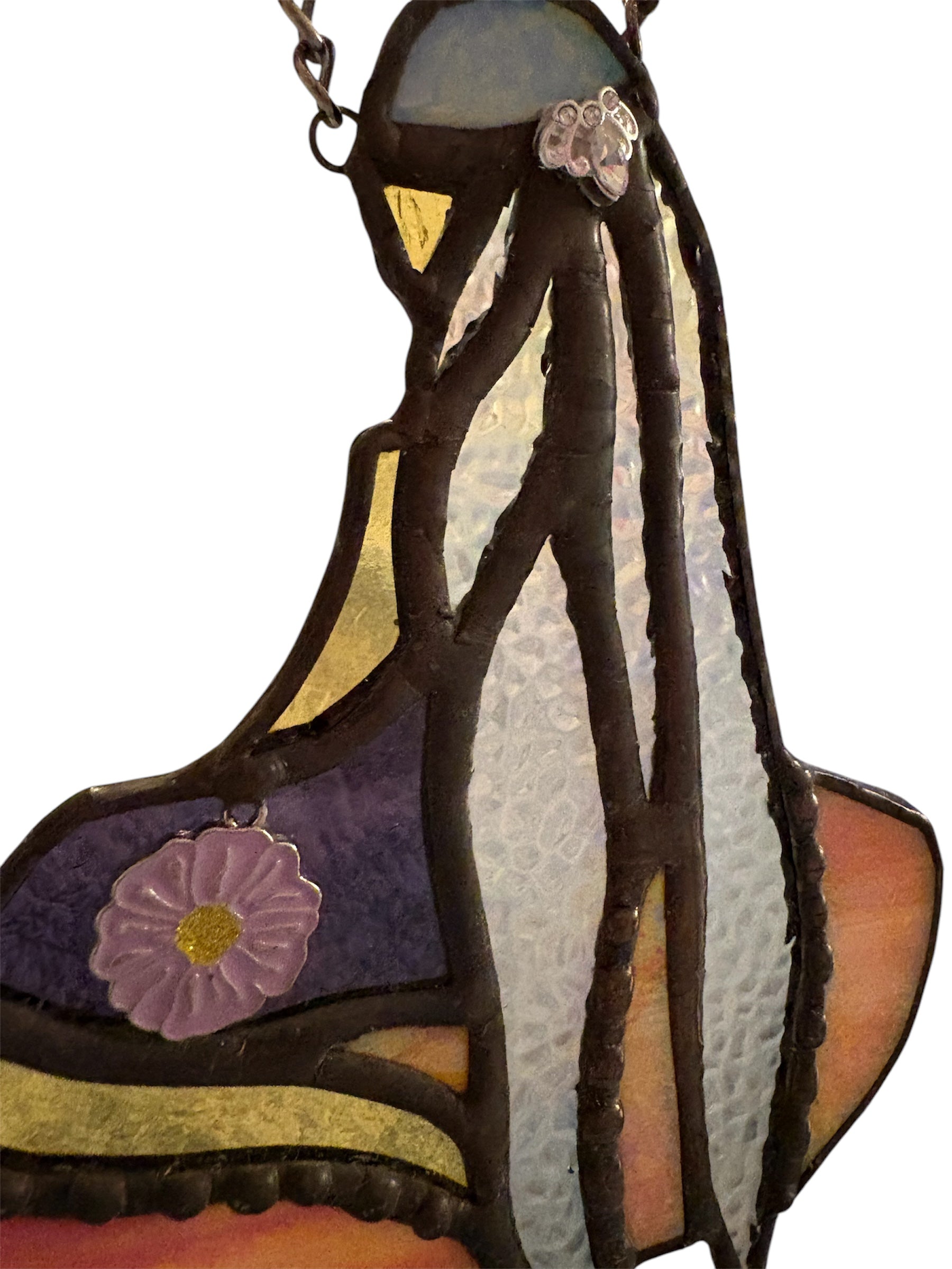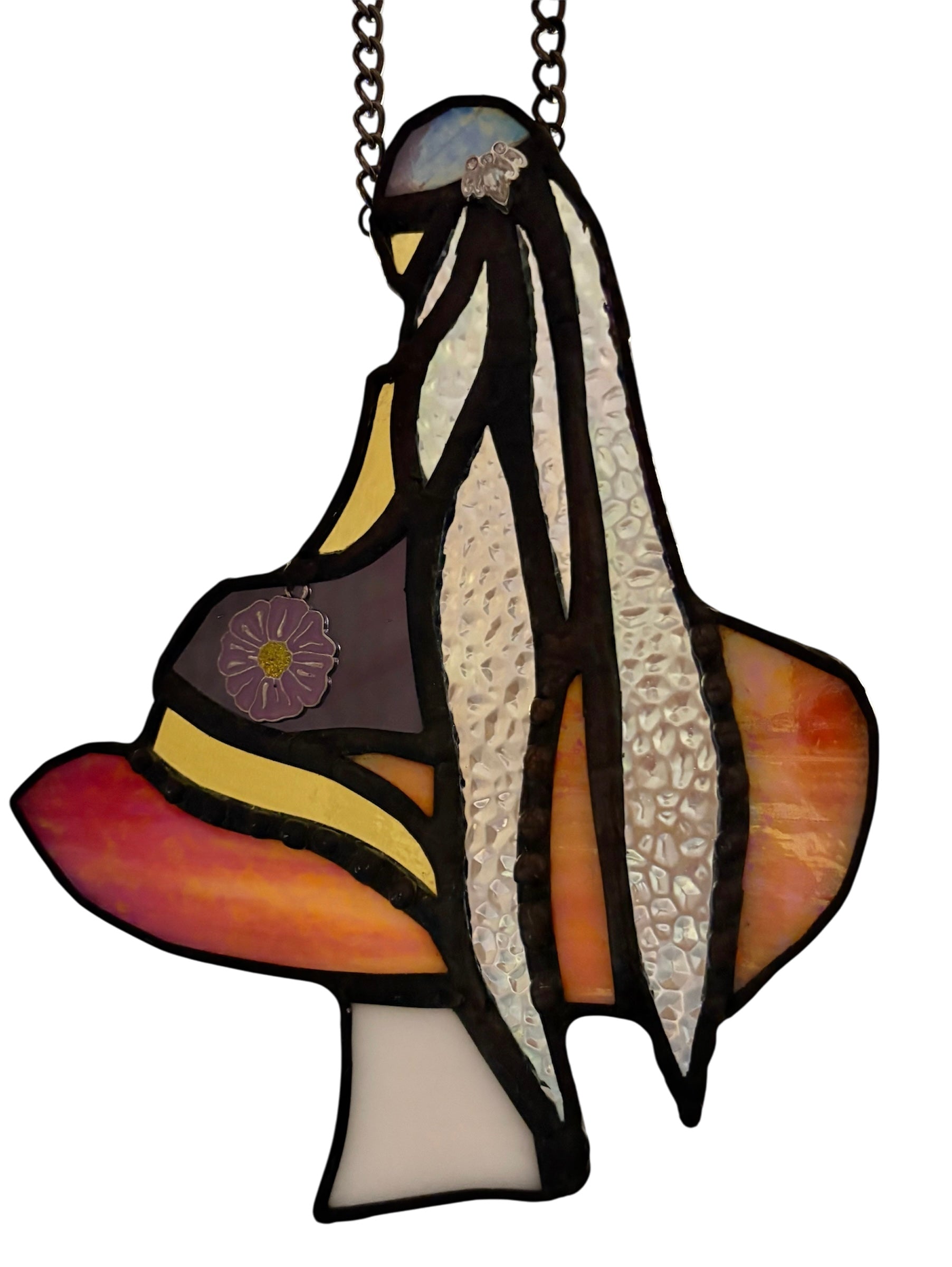 Created in genuine stained glass using the copper foil method & finished in a black patina for a quality piece of glass art to last throughout the years!