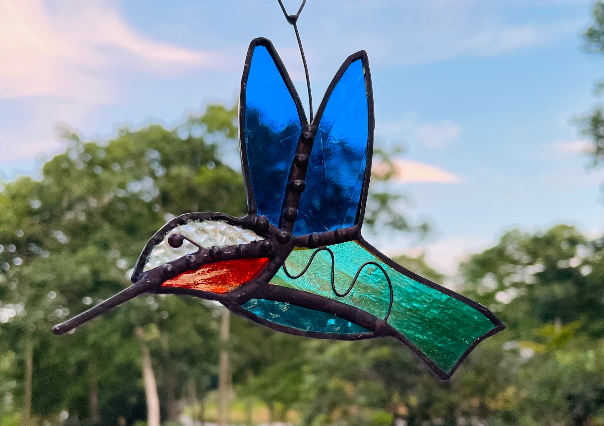 Created in genuine stained glass using the copper foil method & finished in a black patina for a quality piece of glass art to last throughout the years!