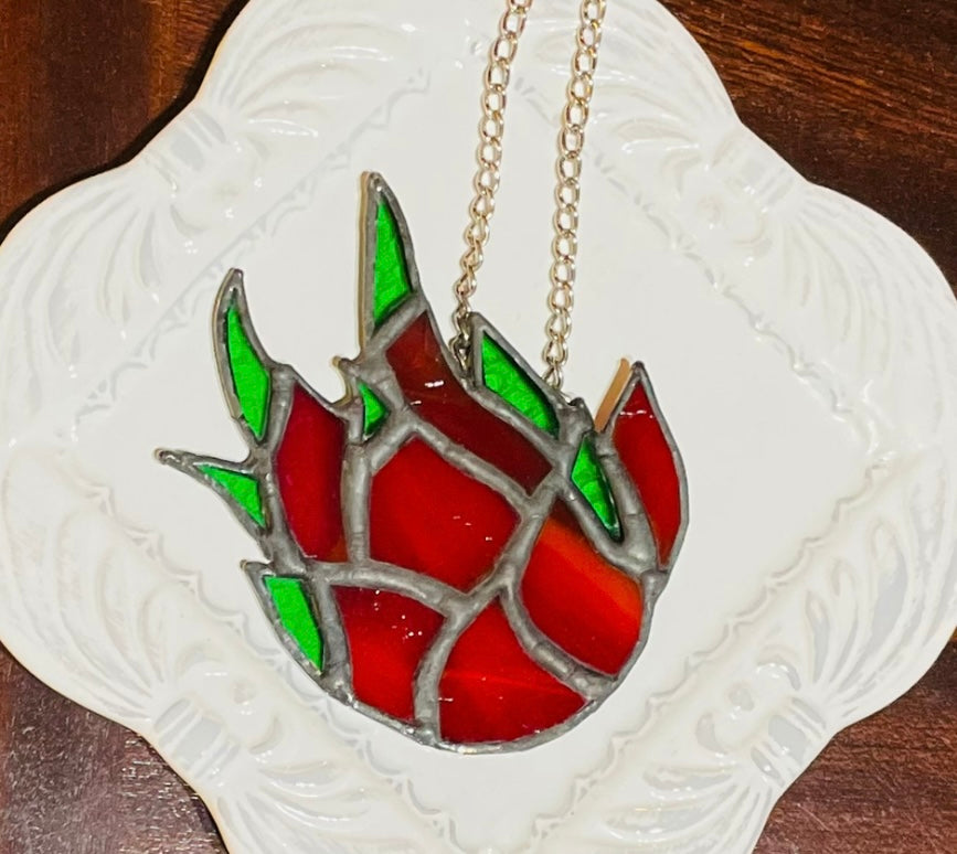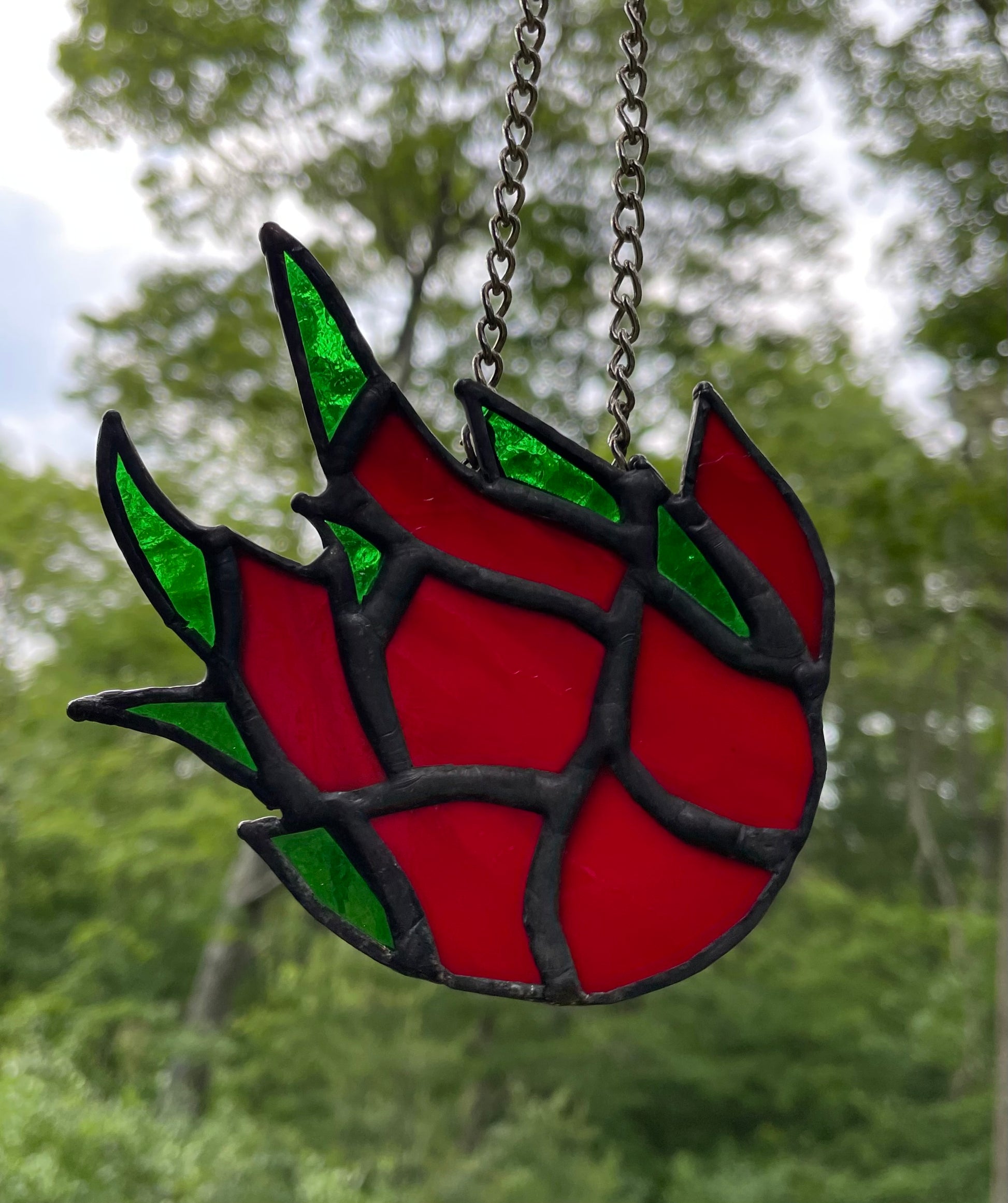 Created in genuine stained glass using the copper foil method & finished in a black patina for a quality piece of glass art to last throughout the years!