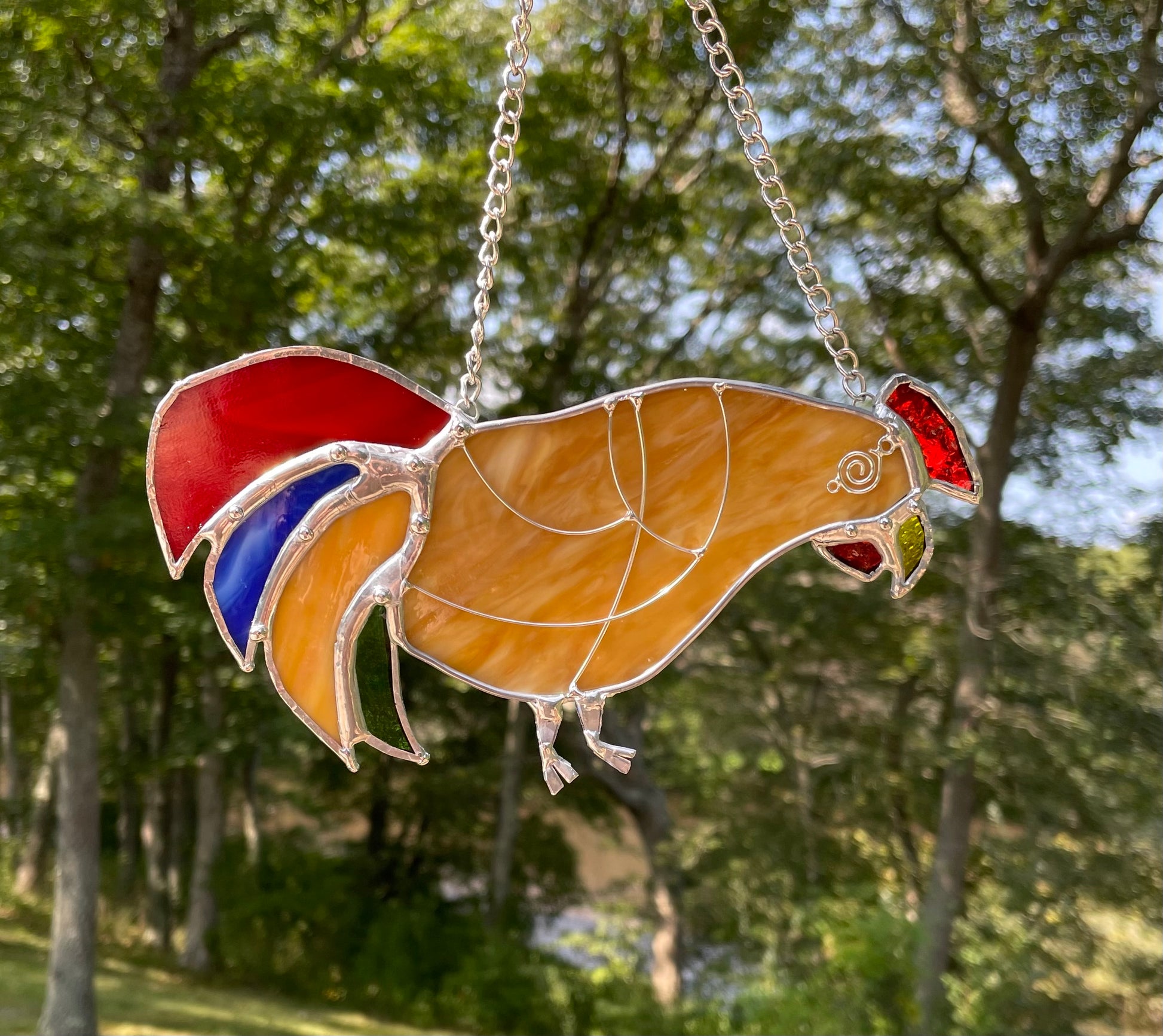 Created in genuine stained glass using the copper foil method & finished in a black patina for a quaity piece of glass art to last throughout the years!